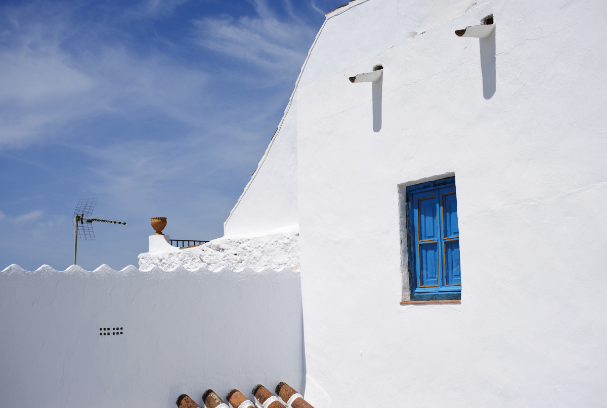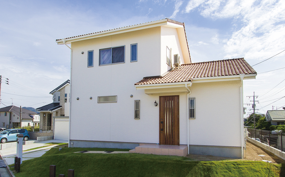 青空と緑の芝生が似合う白亜の外観。オレンジ色の素焼きの屋根瓦が、可憐な印象を与えます。