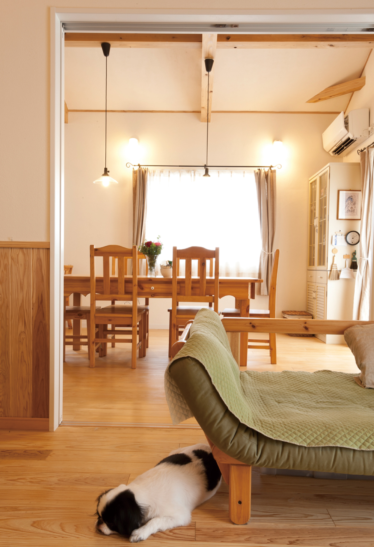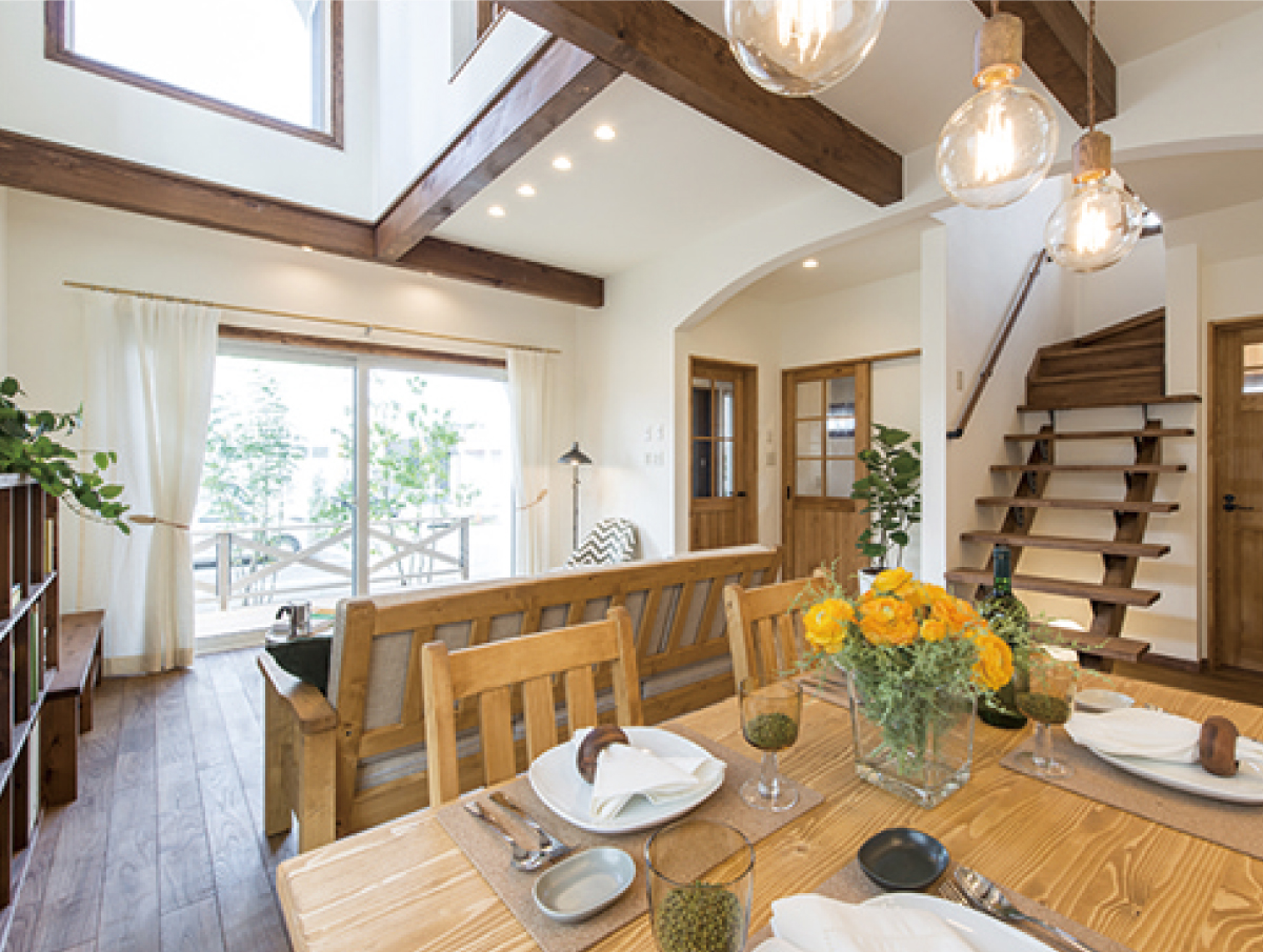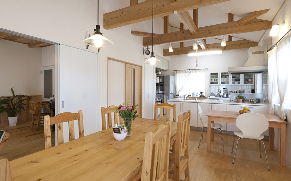 高い天井にかかる梁が目を惹くLDK。大きなダイニングテーブルも、間取りにあわせて造作された一点ものです。