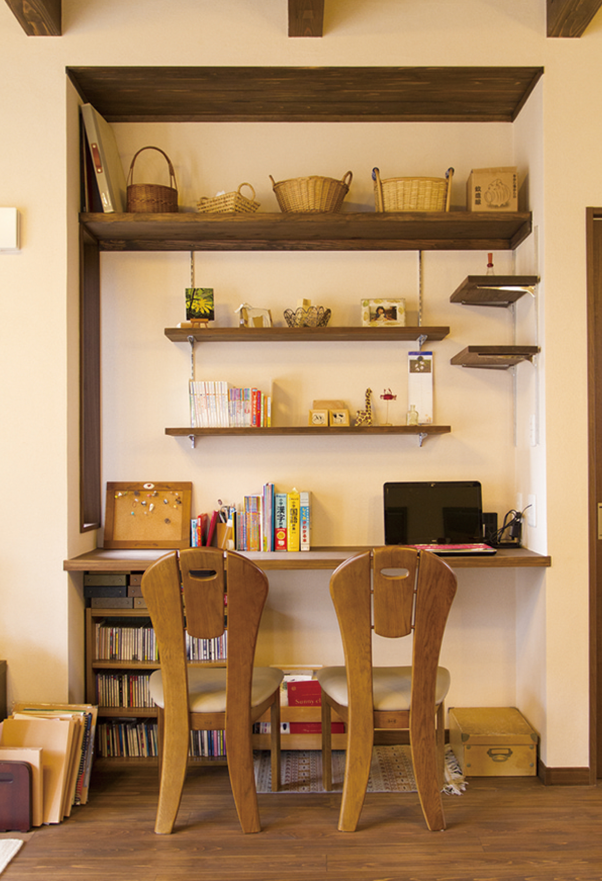 キッチンの隣りに設けられたカウンターと造作棚。パソコンやちょっとした家事のスペースとして、毎日活躍しています。