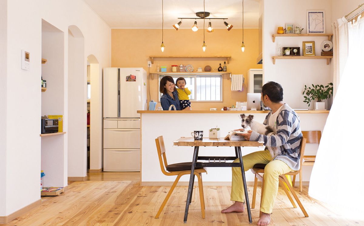 リビングの壁面は「レーベン」で塗られています。高い調湿効果や有害物質の吸着効果で、小さなお子様にも安心の環境です。