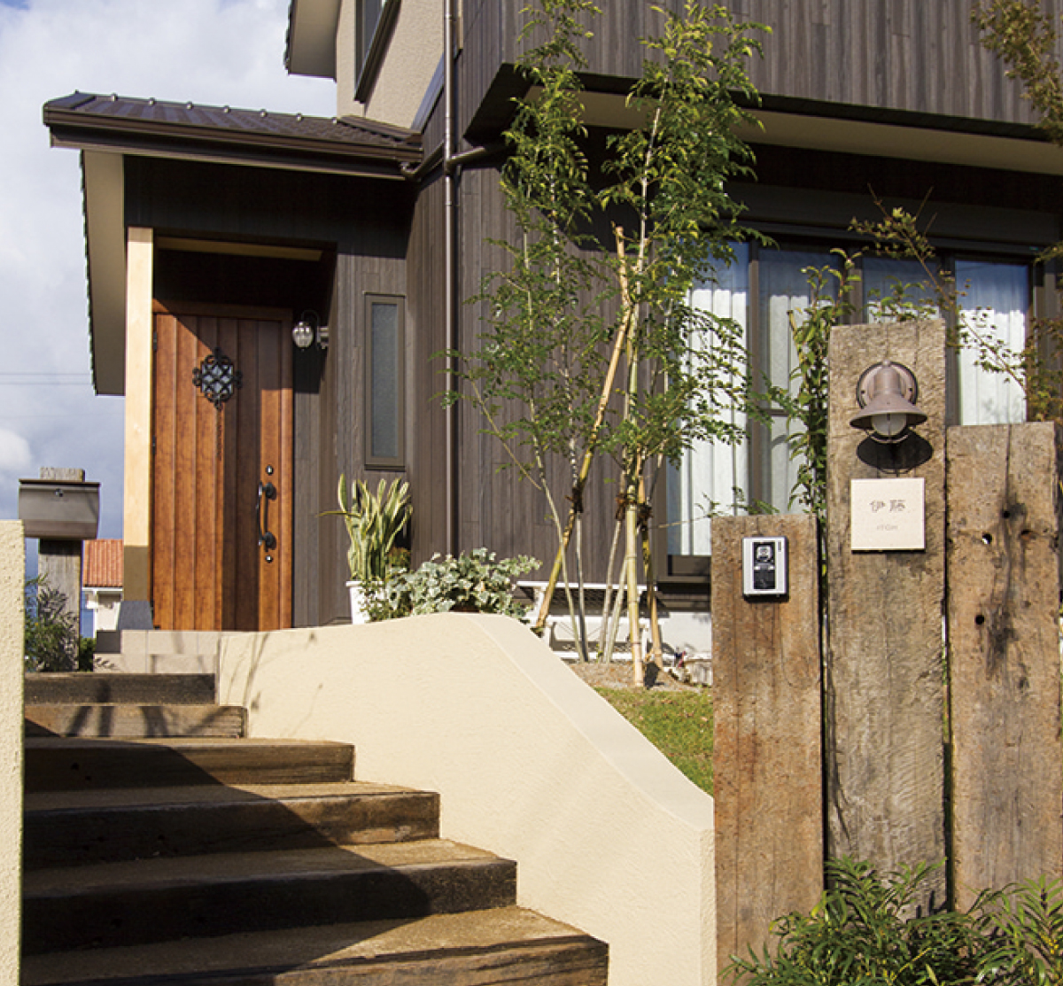 外観をより一層ひきたてる外構。枕木の廃材を利用した温もりのあるアプローチが、来客をあたたかく迎え入れます。