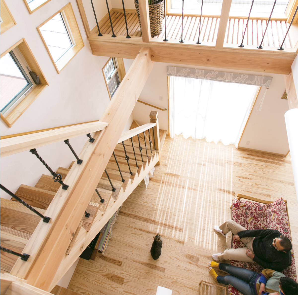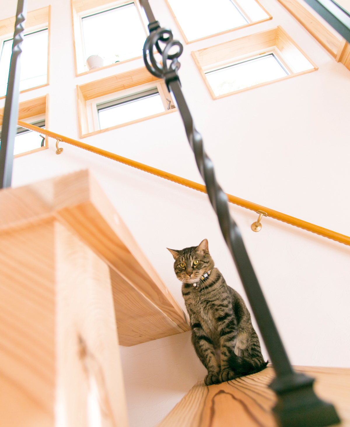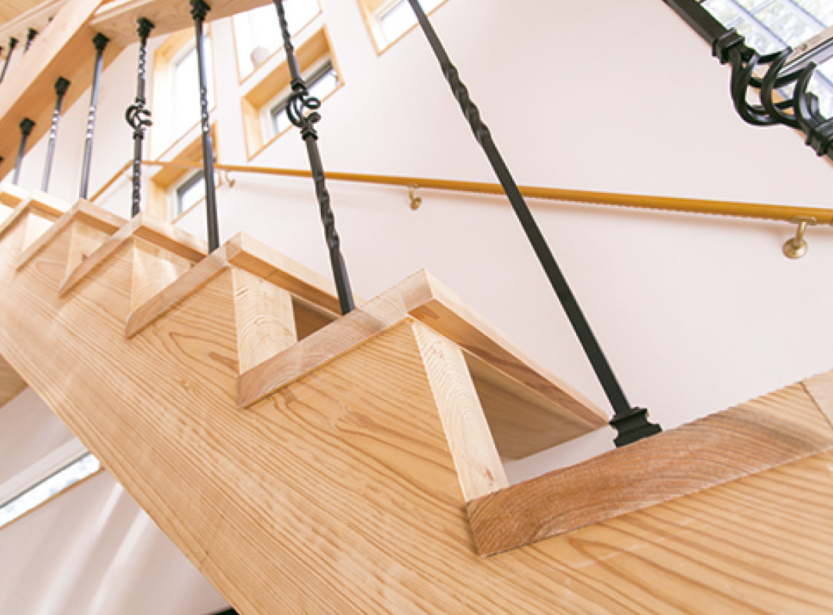 天然木の階段に似合うアイアンの手すりも〈レバンテ〉の標準仕様の一つです。お好みによって、様々なデザインが選べます。