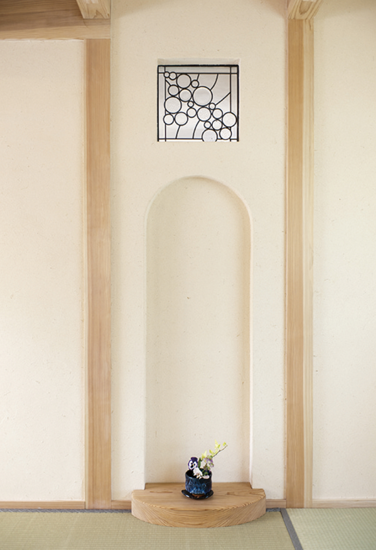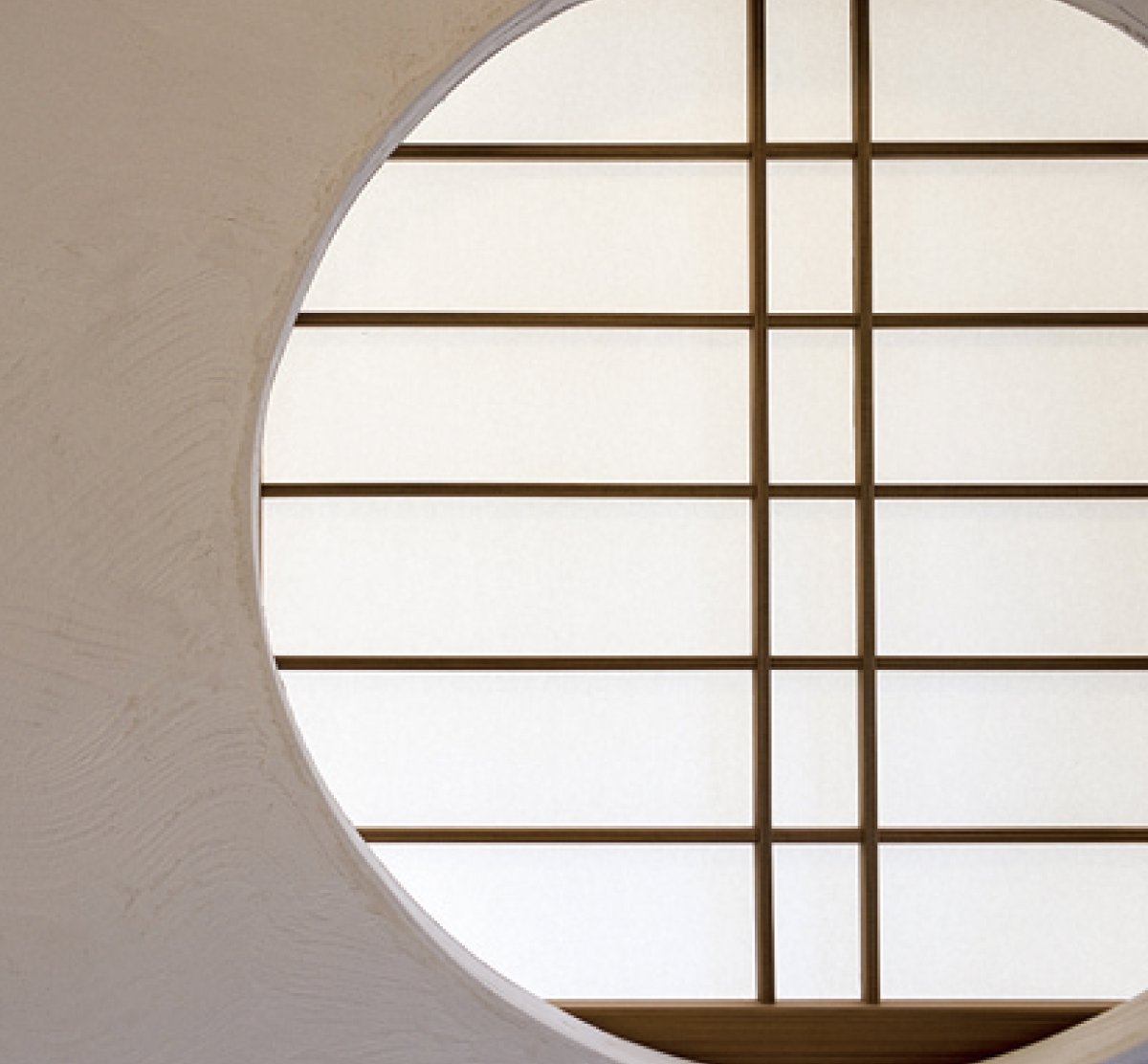 丸窓に障子の直線がモダンな印象を与えます。ご注目いただきたいのは塗り壁の仕上がり。自然素材は職人の技があってこそ活かされます。