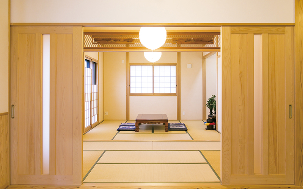 天竜檜製の造作扉の向こうは二間続きの和室。涼しげな印象の欄間が、空間を広々と見せてくれます。