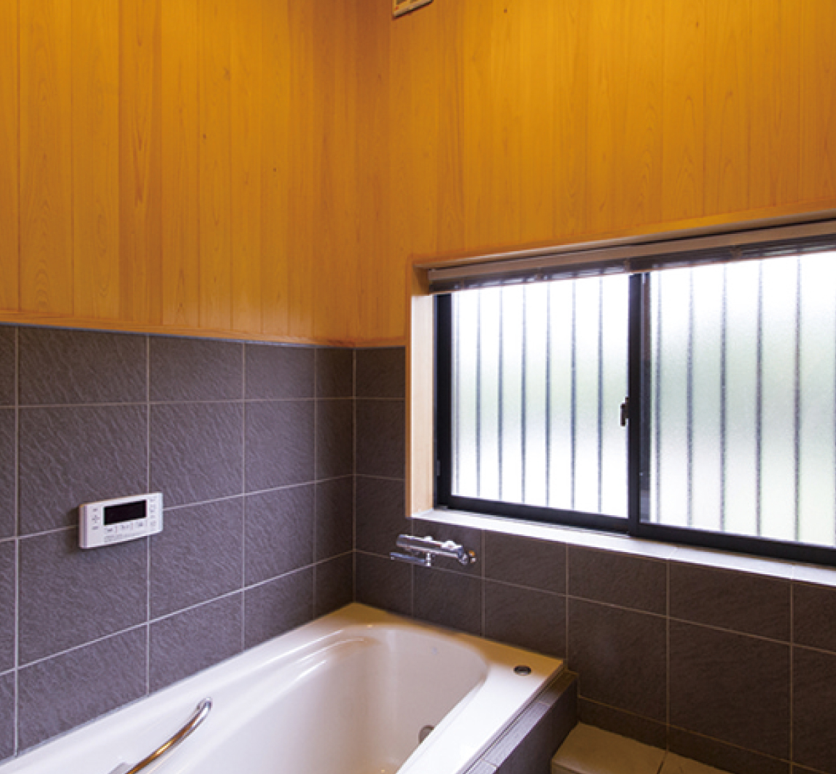 檜の香りが清々しい浴室。汚れが付きやすい下の部分にはタイルを使用し、風情と使いやすさを両立させました。