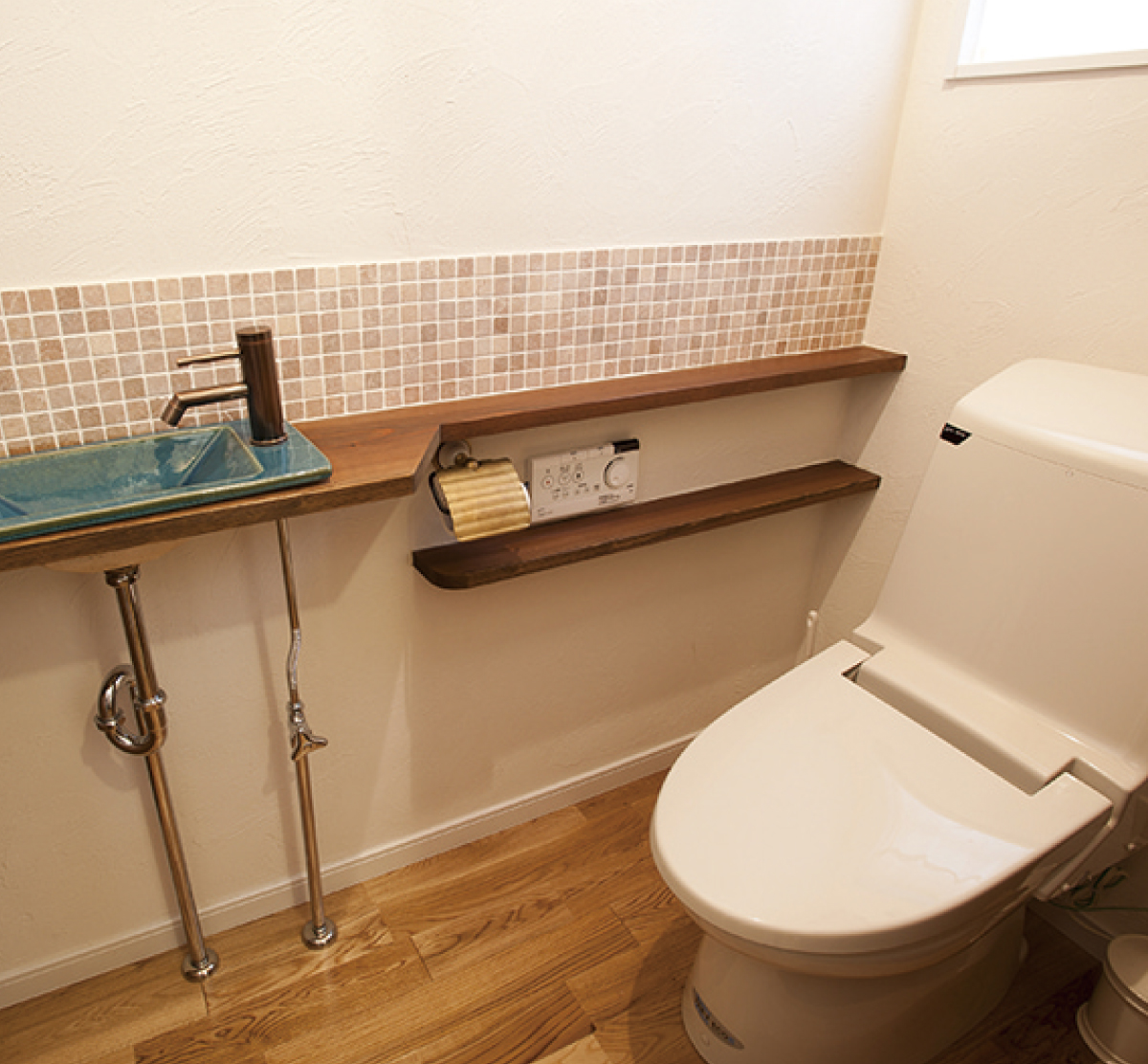 トイレ周りも木とタイルで造作。壁面に塗られた和紙の壁紙「レーベン」が臭いを吸着し、クリーンな環境を保ってくれます。