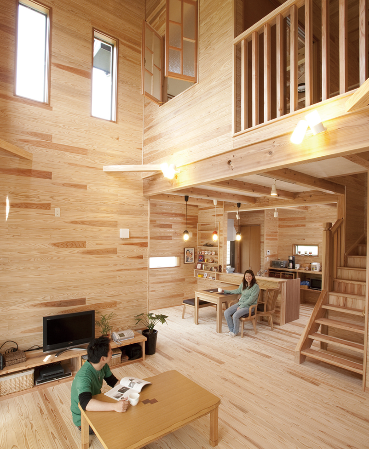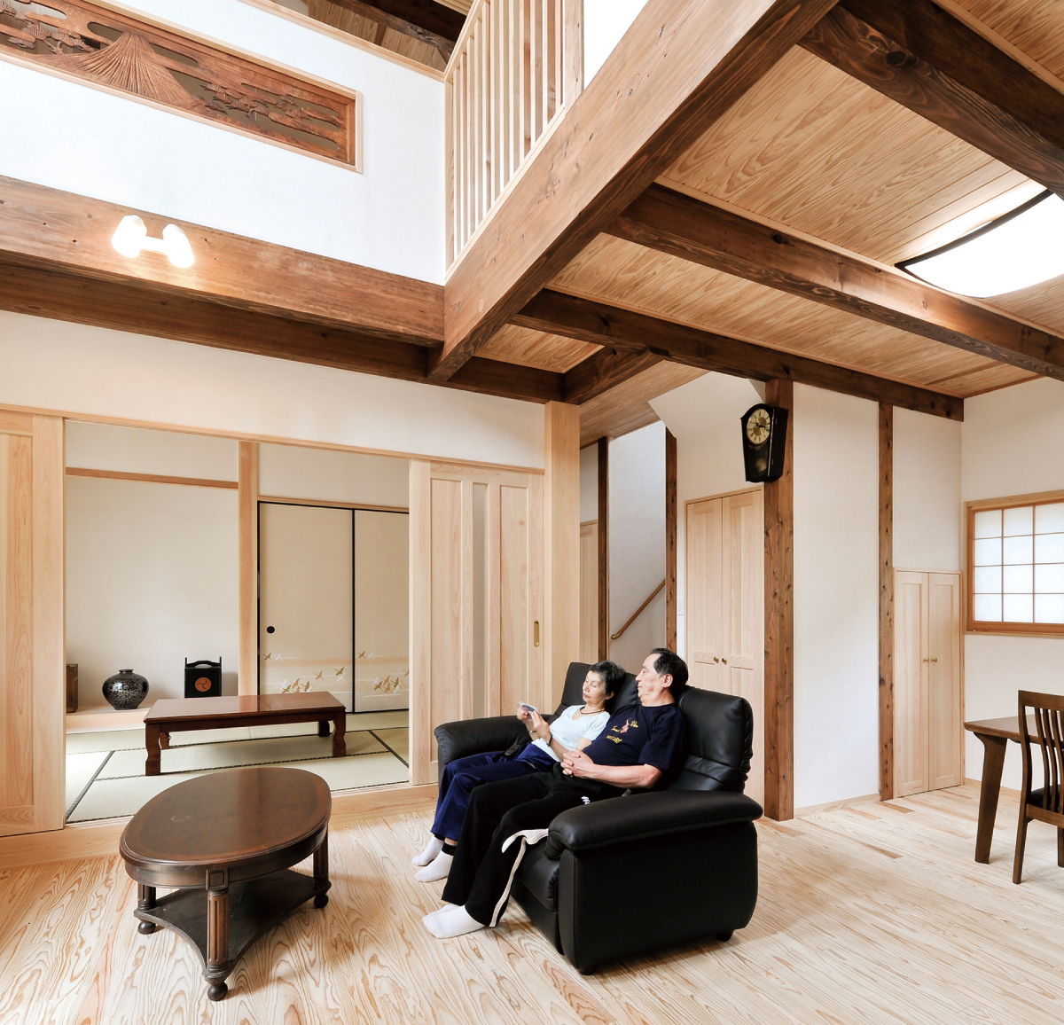 古民家風の空間をお望みだったオーナーのご要望に応え、柱や梁を茶褐色に塗装。2階手すりに埋め込まれた欄間がデザインのアクセントになっています。